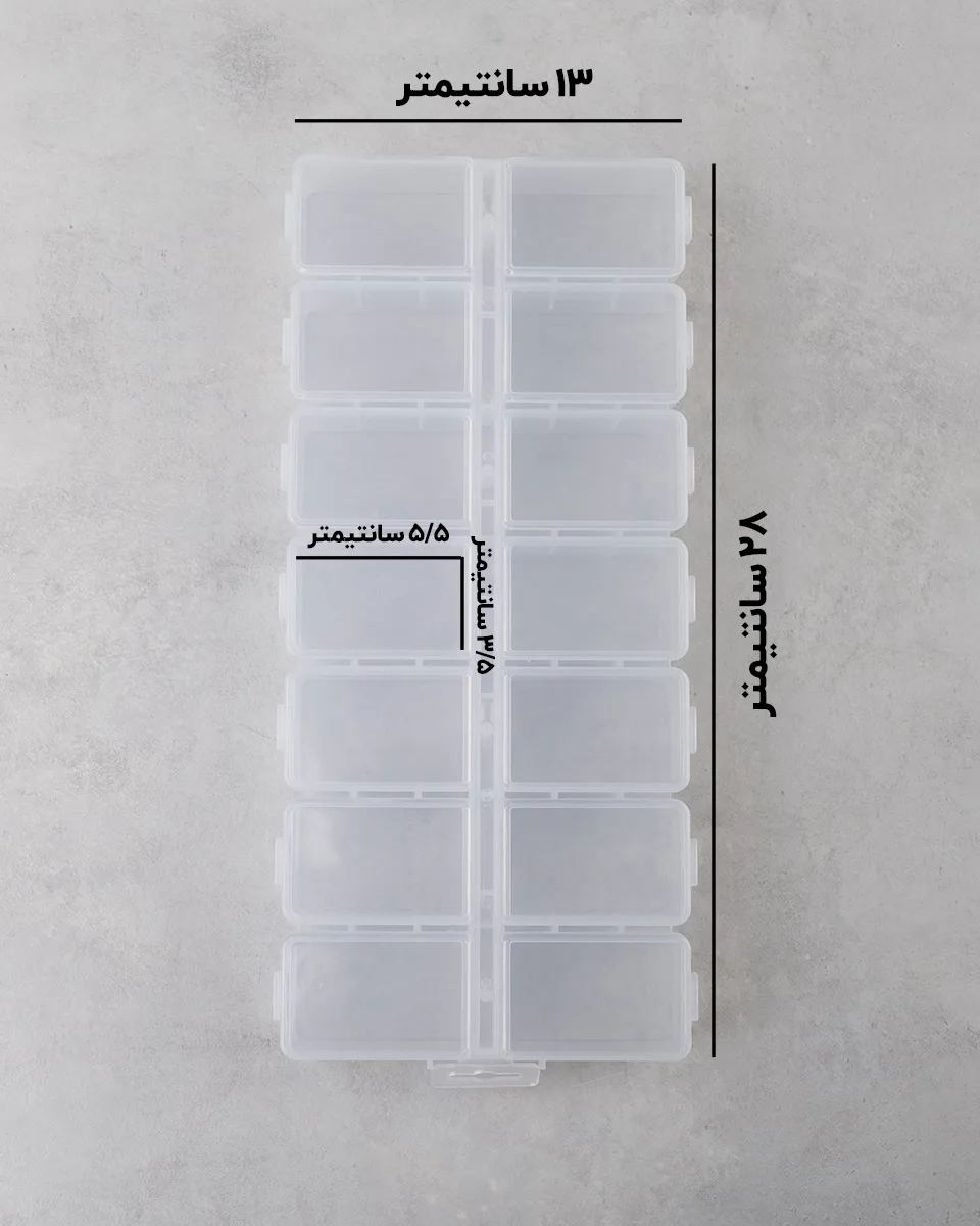 این ارگانایزر 14 تایی فقط مخصوص کارهای هنری نیست. از آن میتوان به عنوان یک جعبه تقسیم عالی برای نگهداری انواع پیچ، مهره، واشر، میخهای ریز، قطعات الکترونیکی کوچک یا حتی به عنوان جعبه قرص استفاده کرد. جنس پلاستیکی مقاوم آن تضمین میکند که تا مدتها دستیار نظمدهنده شما در خانه یا کارگاه باقی بماند.